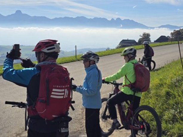 Zur letzten PTS-Tour im 2025 trafen sich 26 Teilnehmende um 09.45 Uhr in Konolfingen um die Wachseldornmoos-Tour unter die Räder zu nehmen. Der herbstliche Morgennebel hatte sich verzogen und so starteten wir bereits bei Sonnenschein. Dennoch kam der Kafeehalt im Rest. Bahnhöfli in Brenzikofen nach 7,5 km gerade rechtzeitig. Aufgewärmt und gestärkt galt es nun bis hinauf zum höchsten Punkt der Gemeinde Fahrni, kräftiger in die Pedale zu treten. Der Aufstieg hatte sich gelohnt. Das Rundum-Panorama, bei der Eduard-Imhof-Gedenkstätte, war einfach wunderschön. Weiter fuhren wir über Feldwege und Velowege hinauf zur Kirche von Schwarzenegg. Die Sonne wärmte, die Aussicht lockte und der Magen knurrte. Kurzerhand wurde das Picknick auf den sonnigen Platz, rund um die Kirche Schwarzenegg, vorverlegt. Am Nachmittag ging es abwechslungsreich auf und ab bis zum Naturschutzgebiet Wachseldornmoos. Kaffee und Kuchen/Nussgipfel wurde in Schibistei genossen. Die letzten 11 km, über Badhaus, Schoubhus, Egglen, Bleiken hinunter bis nach Oberdiessbach, wurden die Bremsbeläge nochmals getestet. Nach dem gemütlichen Schlusshöck im Rest. Löwen gings auf bekanntem Veloweg retour zum Ausgangspunkt. Allen Teilnehmenden und Schlussfahrern ein herzliches Dankeschön für die umsichtige Fahrweise und dass die Tour pannen- und unfallfrei verlief. Herzlichen Dank auch den Co-Leitern Franco, Beat und Fritz, welche es möglich machten in kleinen Gruppen unterwegs zu sein!